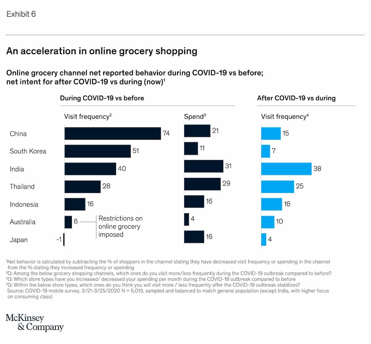 図3. オンライン食品チャネルへの訪問頻度、消費のコロナ前、コロナ中、コロナ後の比較。出典: McKinsey & Companyもともと、中国はオンライン小売取引額が世界で最も大きな国である。マッキンゼー・デジタルの「China digital consumer trends 2019」によると、2018年にオンライン小売販売額は1.5兆ドルに膨れ上がり、中国の小売総売上高の4分の1に相当し、中国以外の10大市場の小売売上高を合計した金額を上回る勢いだった。中国の8億5,500万人のデジタル消費者は、世界で最も熱心に携帯電話やソーシャルメディアを利用しているユーザーの一人である。