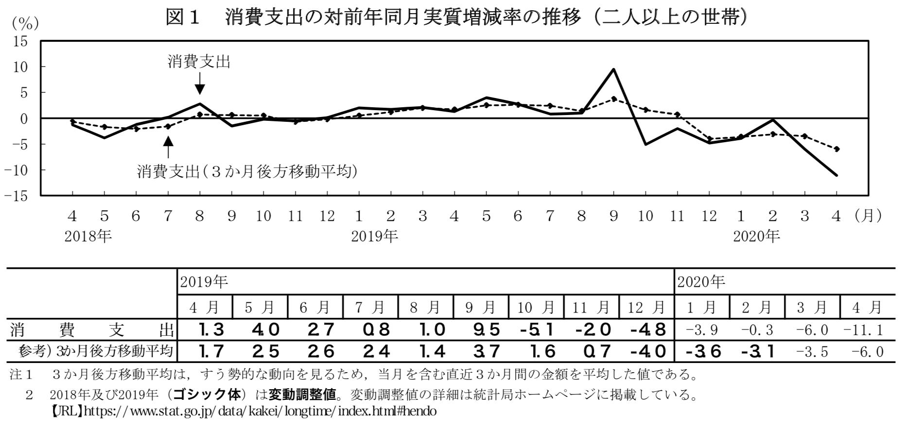 2人以上の世帯の消費支出は26万7922円と、物価変動の影響を除いた実質で前年同月比11.1%減った。減少率は比較可能な2001年以降で最大。外出自粛でパック旅行費が97.1%減、外食が67.0%減などサービス分野を中心に壊滅的な数字を記録した。