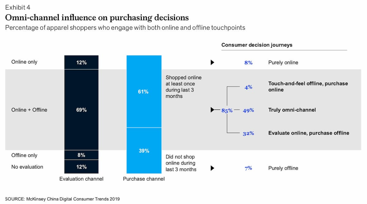 消費がオフラインからオンラインに移転しているという単純な物語ではない。消費者はオンラインと物理的なチャネルの境界を曖昧にし続けている。報告書によると、中国最大のEコマースカテゴリーであるアパレルでは、買い物客の85%がオンラインとオフラインの両方のタッチポイントを利用する。完全にオンラインで消費するのは8%に過ぎず、また、オフラインで商品を調べてオンラインで購入するのも4%に過ぎない。