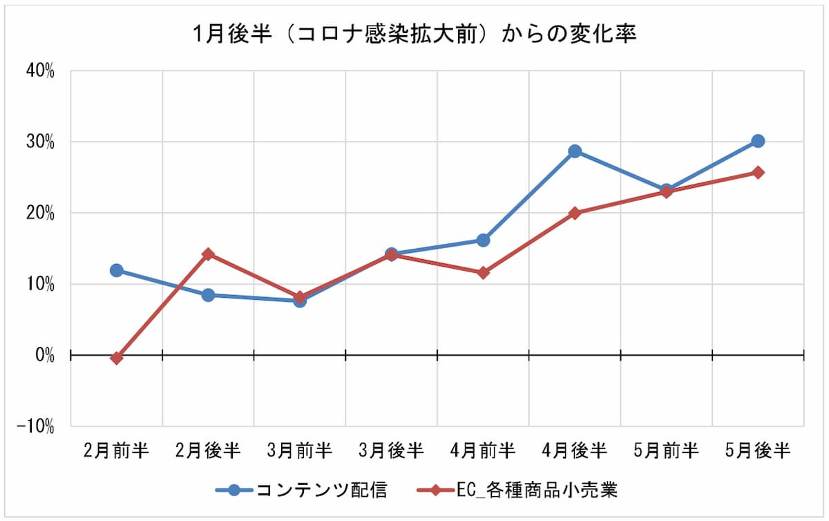 「コンテンツ配信」や「EC」は5月後半も伸び続けており、在宅時間が減り外出時間が増えても、その2分野に対する需要は引き続き伸びていたことが分かる。これが6月以降も続くか、とても興味深い。
