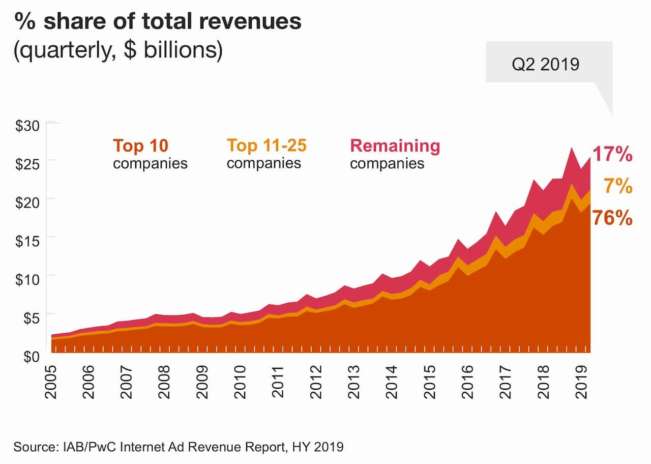 図1. 上位10社で米インターネット広告市場の76%を占めるが、実際にはGoogleとFacebookの2社が突出し6割を占めている。Source: IAB internet advertising revenue report, 2019 first six months results.