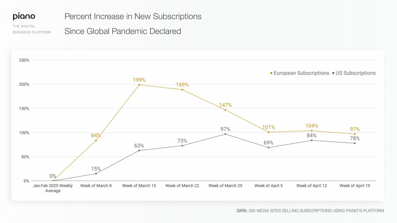 図2. パンデミックが宣言された3月11日あたりを境にスパイク Source: Piano "Subscriptions Rise With Coronavirus Coverage - Weekly Updated Chart"