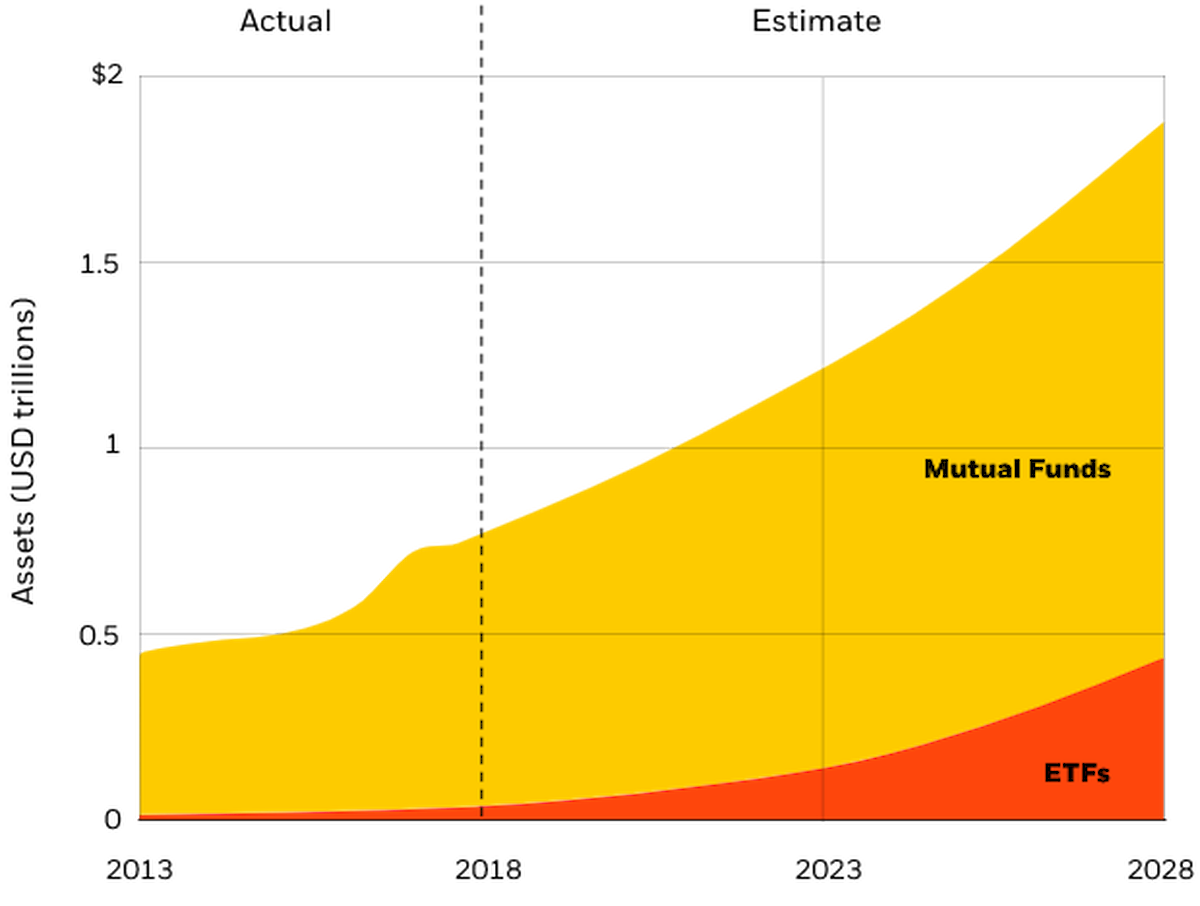 持続可能な投資信託・ETFの資産額、2013年~2028年 Source: BlackRock