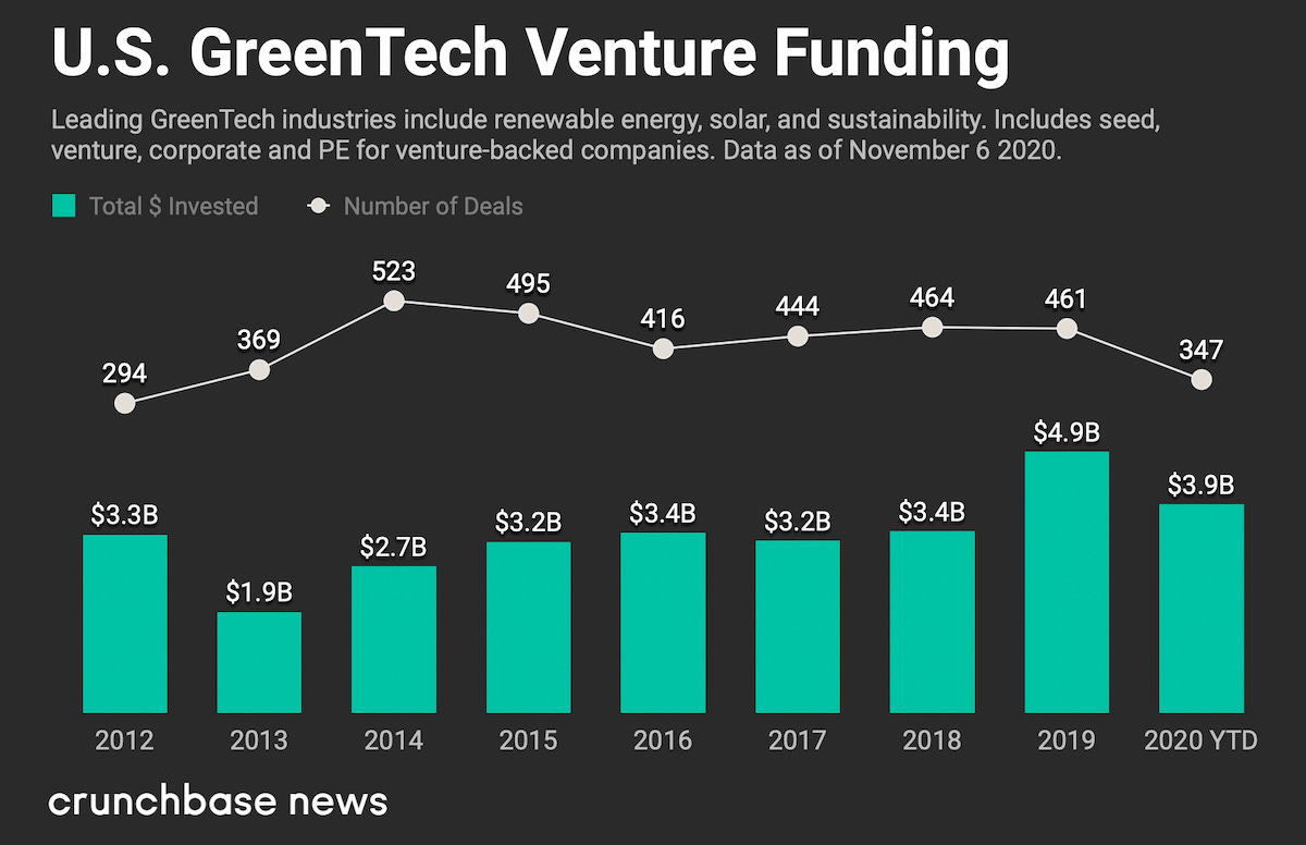 しかし、VCからも環境の変化に適応するプレイヤーが現れている。Crunchbaseのデータによると、2012年から2018年の間に2回目の緩やかな投資の急増があり、そのピークは2019年の49億ドルに達している。11月時点で、2020年には投資家はクリーンテック新興企業に39億ドルを投入していることが確認されていた。今ではBlackstoneやBlackRockのような企業や他の気候変動対策ファンドから新たな資本がクリーンテック企業に注入されている。