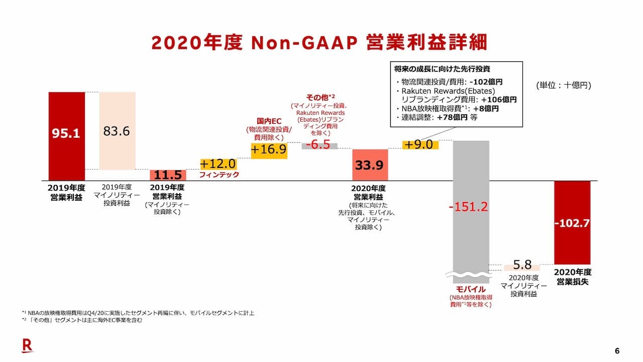 楽天は2020年通年で、1兆4,555億円の売上収益を上げている。Non-GAAP営業利益は−1,027億円。これはほぼモバイル事業への投資によるもので、モバイルを含む投資事業を除いたGAAP営業利益は443億円。Eコマースの規模を示す流通総額は22.3兆円。