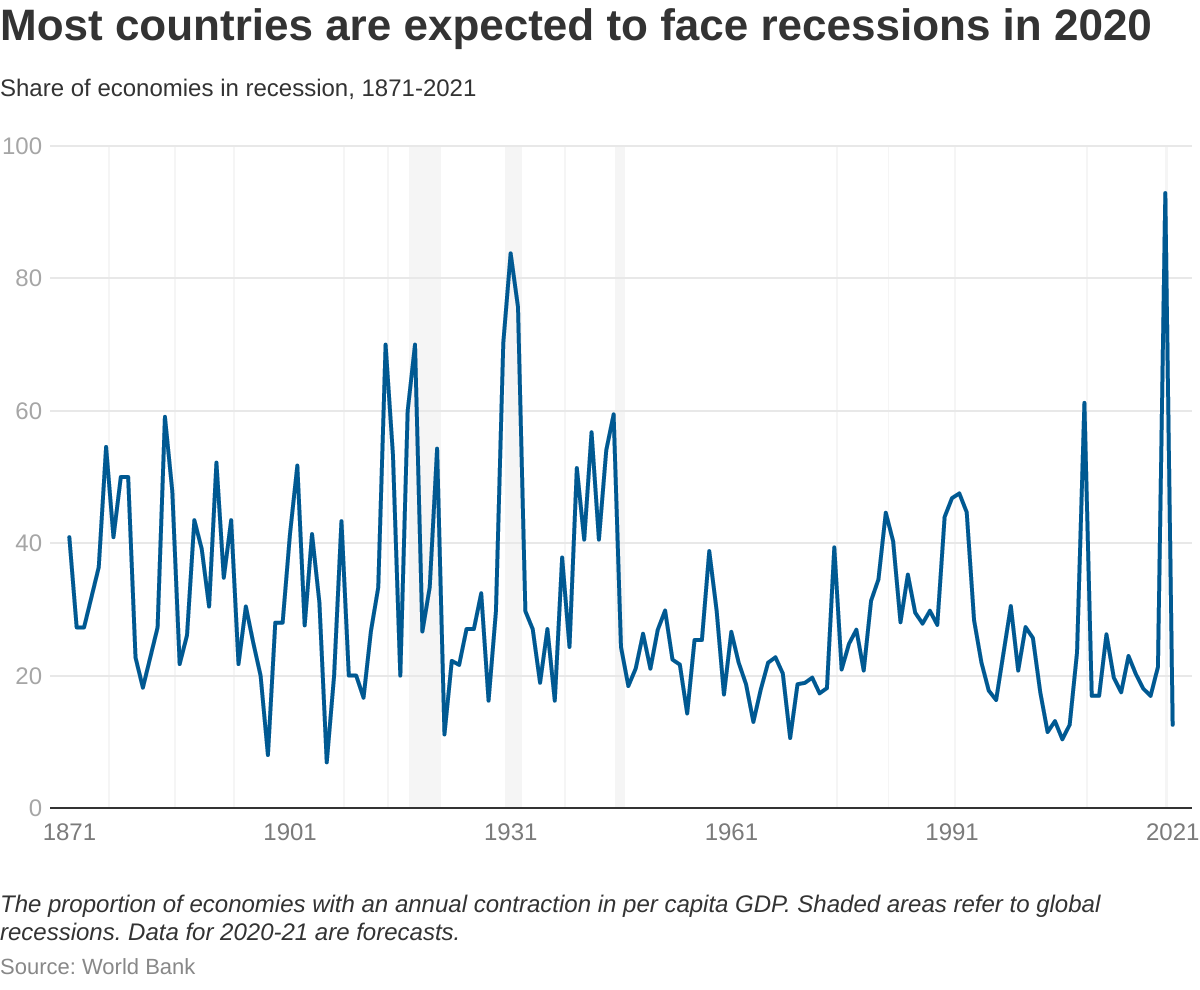 新型コロナの影響で、日本経済は欧米諸国と同様、厳しい状況にあると考えられる。6月8日発表の世銀予測は、2020年には世界のGDPが5.2%縮小すると想定し、日本のGDPは6.1%縮小すると予測した。パンデミックの影響で、ほとんどの国が2020年には景気後退に陥ると予想され(図1)、1870年以降、世界の国々の中において最大の割合で一人当たりの所得が減少している。