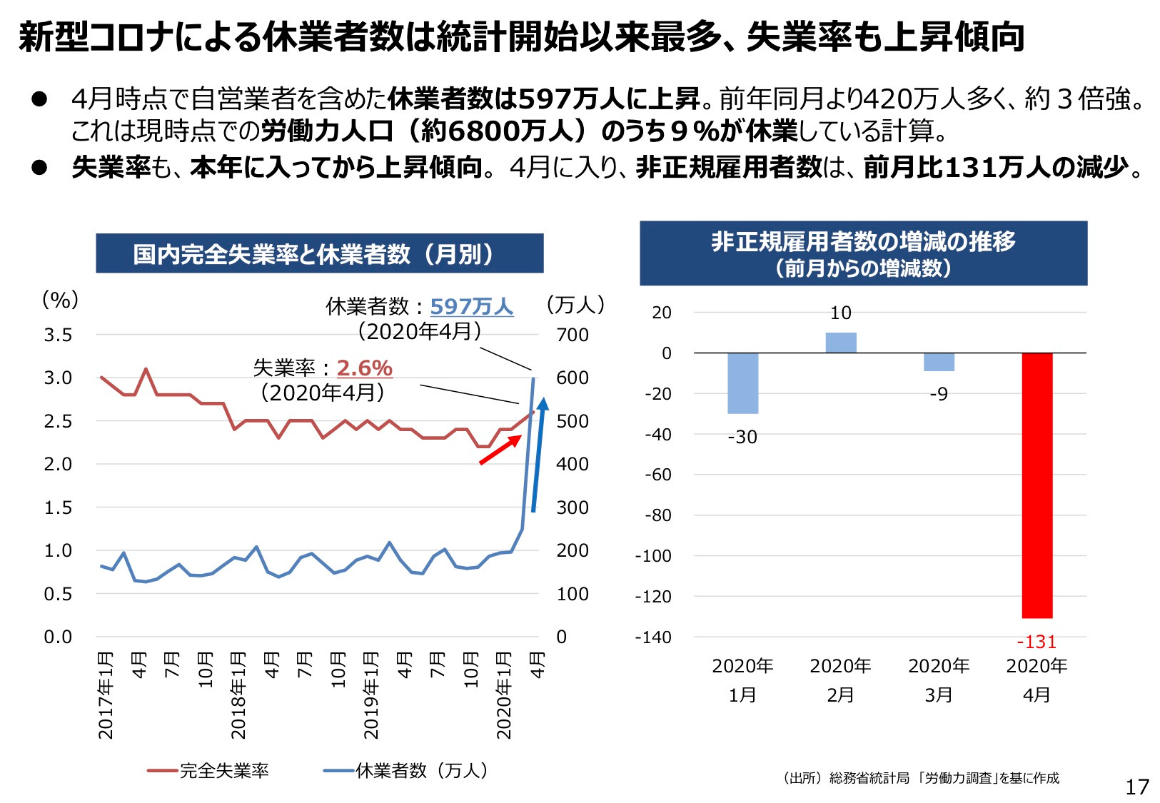図2. COVID-19 景気後退は、1990年以降の世界的な景気後退の中で、成長予測の下方修正が最も速く、最も急峻なものとなった(3月以降の急降下をみてほしい)。日本でも苦境に喘いでいる人はたくさんいる。休業者数が統計開始以来最多に達し、失業率も上昇傾向にある。経産省の『新型コロナウイルスの影響を踏まえた 経済産業政策の在り方について』によると、休業者数は597万人に上昇。労働力人口(約6800万人)のうち9%が休業している計算。今後、企業倒産が増えた場合、支えられなくなった休業者は失業者へと転換される可能性がある。4月に入り、非正規雇用者数は、前月比131万人の減少だった。