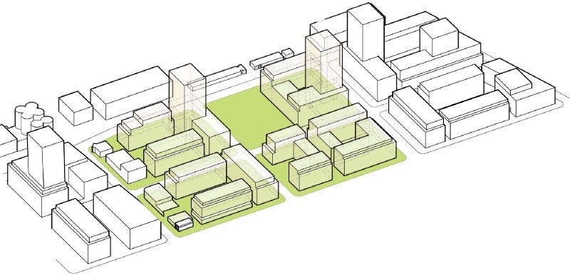 Open space — 45.3%、Daylight access — 49%、Total gross floor area (GFA) — 1,513,144 square feetの開発シナリオ例。Source: Sidewalk Labs.