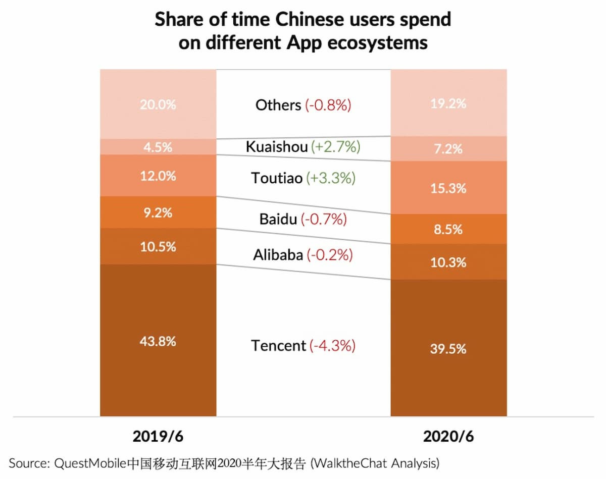 Bytedance (Toutiao) がアプリ利用時間のシェアで存在感を示している(15.3%)。数年前まで単一の支配的な存在だったTencentは39.5%まで減らしている。Image via ウォークザチャット/QuestMobile