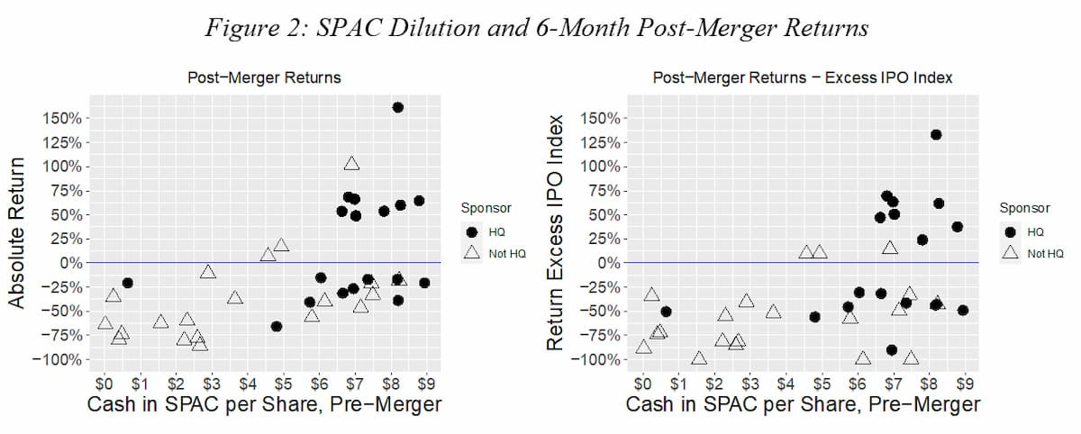 SPACの中には、合併後に株主にプラスのリターンをもたらす企業もある。大規模なプライベート・エクイティや元フォーチュン500のCEOや上級管理職がスポンサーとなっているSPACは、平均的に他の企業よりも成功している。しかし、そのようなSPACであっても、希薄化は大きく、リターンはまちまちであり、そのコストはSPACの株主やターゲット企業の株主、あるいはその両方が負担することになる。