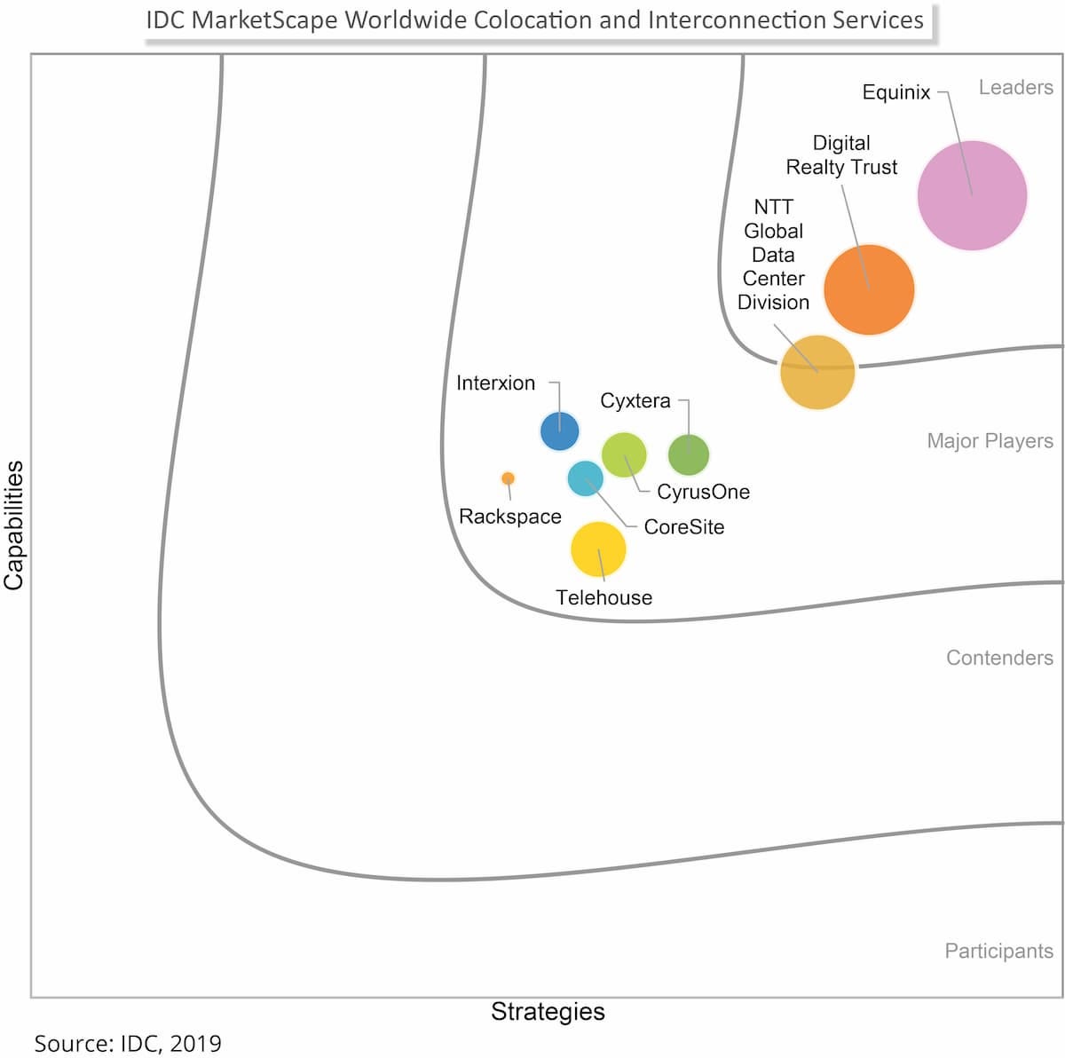 知られざるマーケットリーダー。IDC MarketScapeレポートでは、コロケーションおよび相互接続サービスのリーダーとしてエクイニクスが評価された。相互接続およびコロケーションサービスベンダー9社の競争力評価の結果という。出典: エクイニクス/IDC